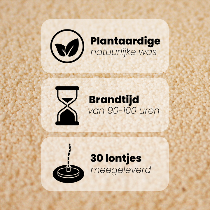 Elke verpakking bevat 400 gram kaarsenzand en bevat een doosje met 30 lonten, goed voor ongeveer 90 tot 100 branduren. Je vult simpelweg een glas of pot met het zand, plaatst een of meerdere lonten in het midden en steekt de kaars aan. Brandt de kaars op? Laat het zand afkoelen, ververs de lonten en verdeel het zand weer gelijk, zo heb je weer een gloednieuwe kaars. Daardoor is kaarsenzand een duurzaam en veelzijdig alternatief voor traditionele kaarsen.
